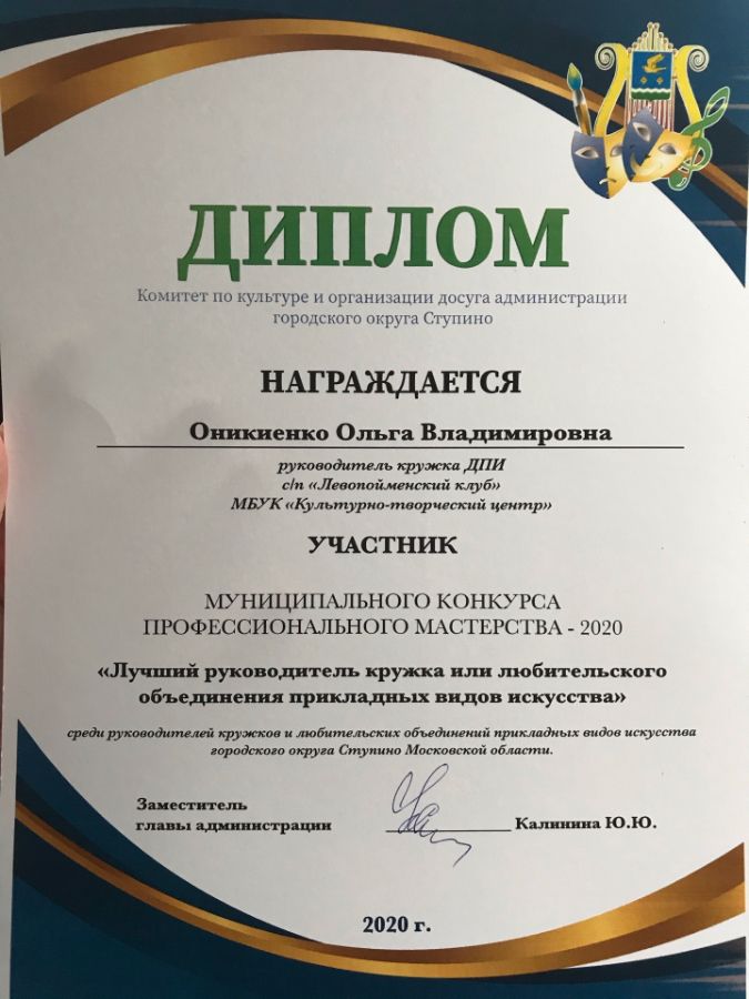 18 февраля руководитель кружков декоративно-прикладного творчества Оникиенко Ольга Владимировна приняла участие в Муниципальном конкурсе профессионального мастерства -2020 «Лучший руководитель кружка или любительского объединения прикладных видов искусства»